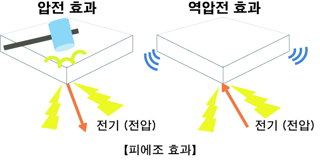 피에조는 압전 소자 (Piezoelectric Element, Piezoelectric Device)를 뜻합니다. 압전 소자는 힘 (압력)을 가함으로써 전압을 발생 (압전 효과)시키거나, 전압을 가함으로써 변형 (역압전 효과)시키는 디바이스입니다.
