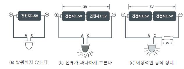 LED(발광 다이오드)가 빛나기 위해서는 그 양 끝에 2V 의 전압을 가할 필요가 있습니다. 따라서 그림1-(a) 와 같이 건전지 1개 (약 1.5V) 로는 전압이 모자라기 때문에 발광하지 않습니다. 이번에는 그림1-(b) 와 같이 건전지 2개를 직렬로 연결하면, 전압 오버 (약 3V) 로 전류가 과다하게 흐르게 되어 LED 가 고장나게 됩니다. 이 때 LED 와 건전지 사이에 적당한 크기의 저항기를 연결해 보면 [그림1-(C)] 와 같이 적절한 밝기로 발광하여, LED 에도 건전지에도 무리를 가하지 않고 동작하게 됩니다. 이와 같이 전류의 흐름을 제어함으로써 전기 회로를 원만하게 동작하도록 하는 역할을 하는 것이 저항기이며, 전기 회로에 없어서는 안 될 부품 중 하나입니다.