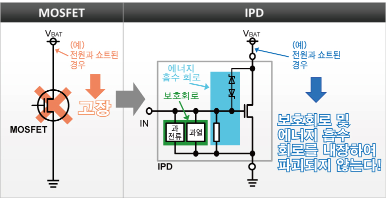 반면에, IPD는 과전류 및 과열에 대한 보호회로와 유도성 부하의 에너지를 흡수하는 회로를 내장하여, 쇼트 등의 이상 상태에서도 파괴되지 않고 스위치로서의 기능을 유지합니다.